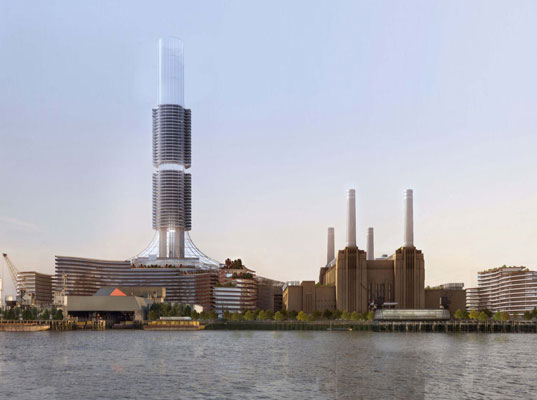 This is an artist’s impression of a plan to convert Battersea Power Station into a source of renewable energy – read the full story at inhabitat.com. It’s all very commendable, and the new structure itself is elegant and interesting, but the old power station’s dominance over the skyline of that corner of London, which is the best thing about it, will be markedly diminished if they do go ahead and build it. I’m not convinced.